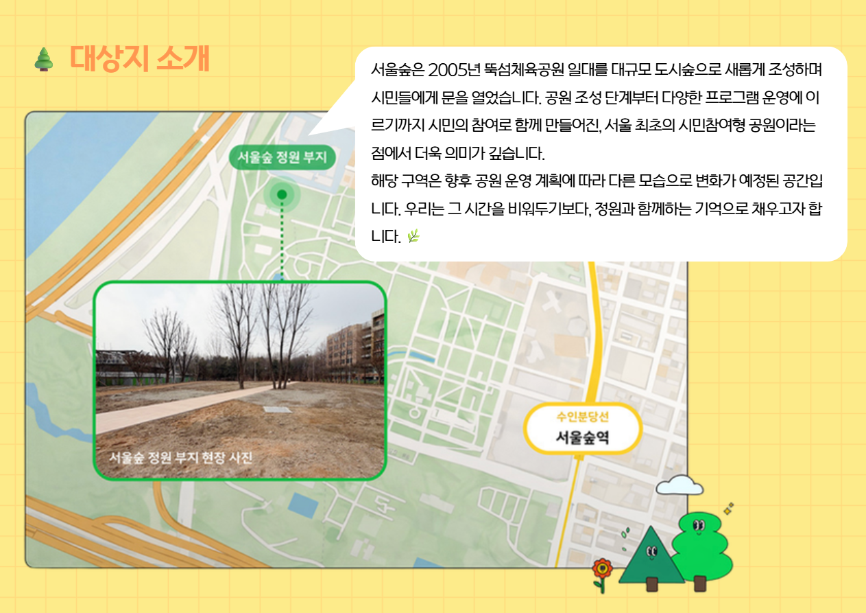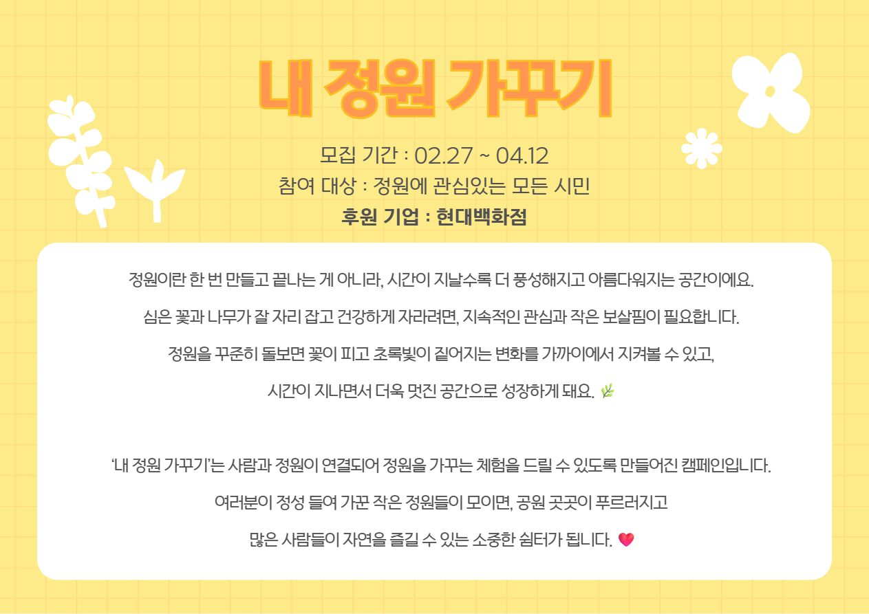 💁♀️ "서울숲-내정원 가꾸기’는 현대백화점의 후원으로 만들어진 캠페인으로, 시민 참여만 가능합니다.